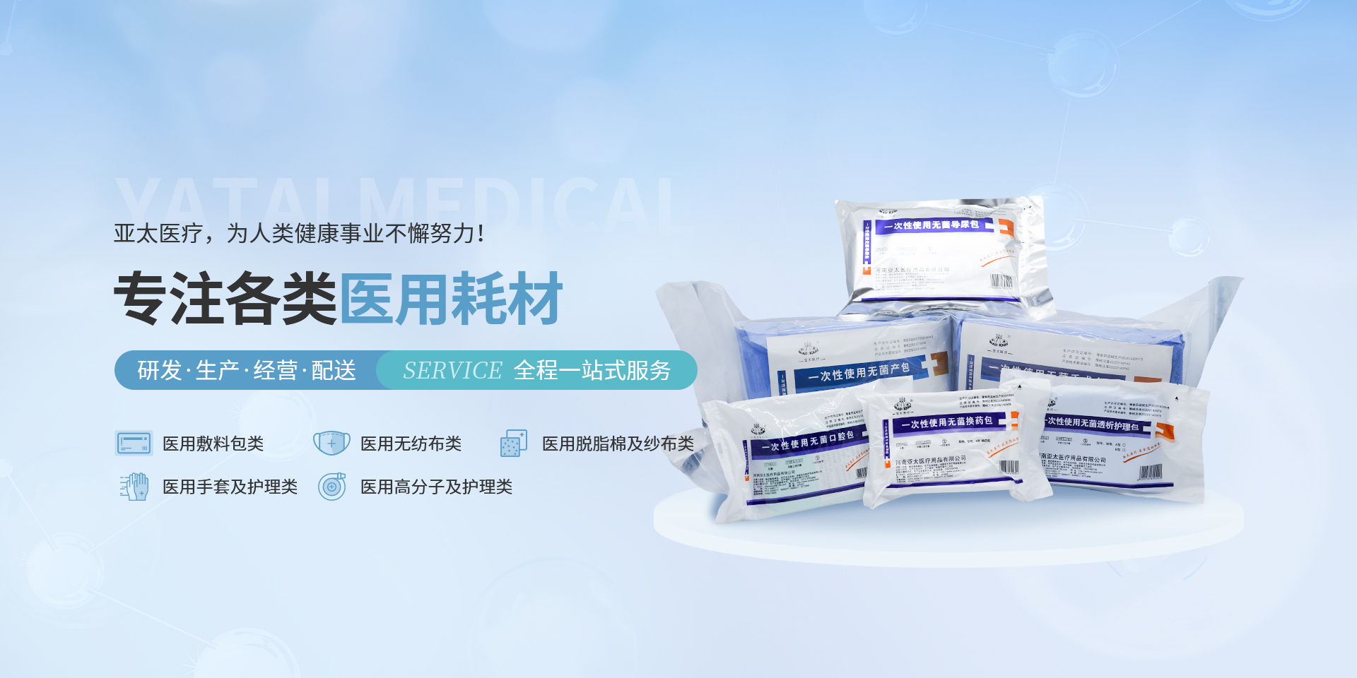 亞太始終專注于一次性醫(yī)療器械、衛(wèi)生材料、高分子及敷料產(chǎn)品的研發(fā)、生產(chǎn)和經(jīng)營,為人類健康事業(yè)的發(fā)展帶來深遠(yuǎn)的意義